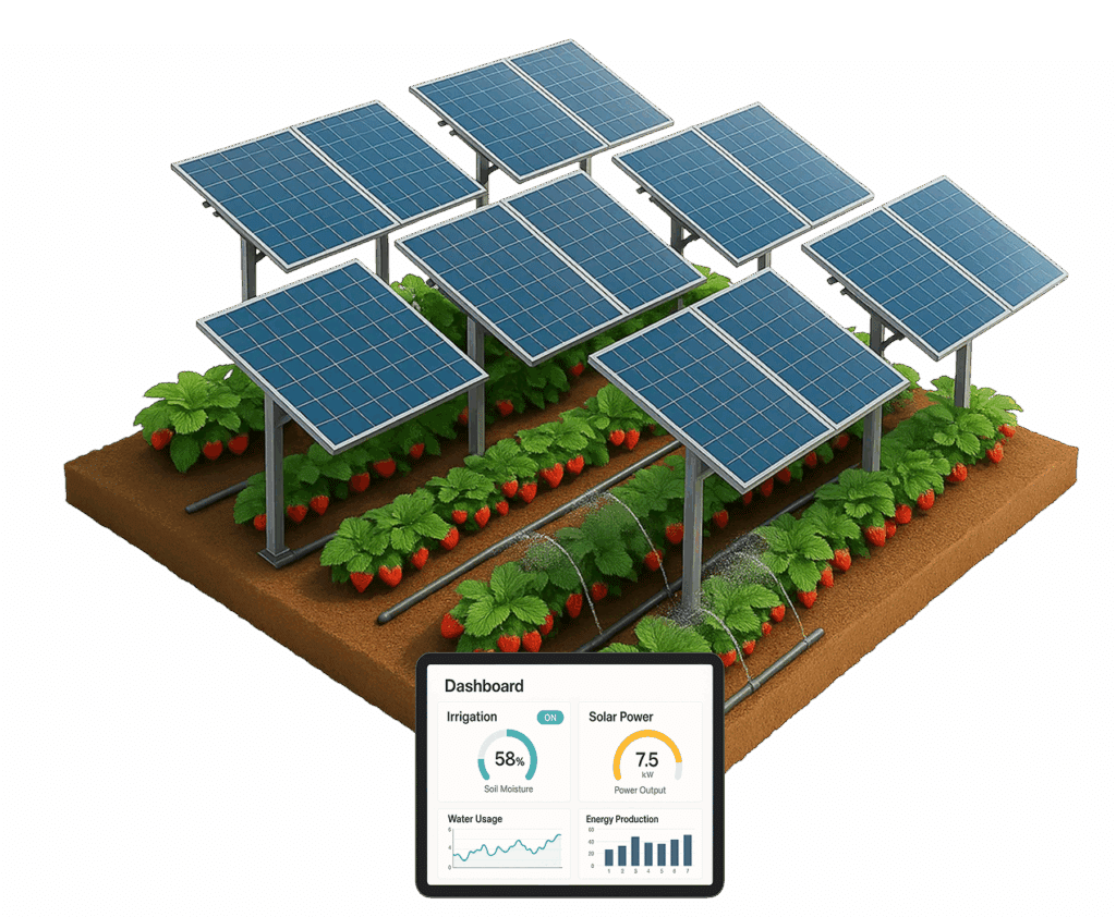 Using real-time soil moisture data, weather forecasts, and crop-specific water needs, an AI-driven irrigation system powered by solar energy will optimize watering schedules. This predictive, automated approach aims to reduce water consumption by up to 40% while ensuring reliable operation powered entirely by renewable energy.